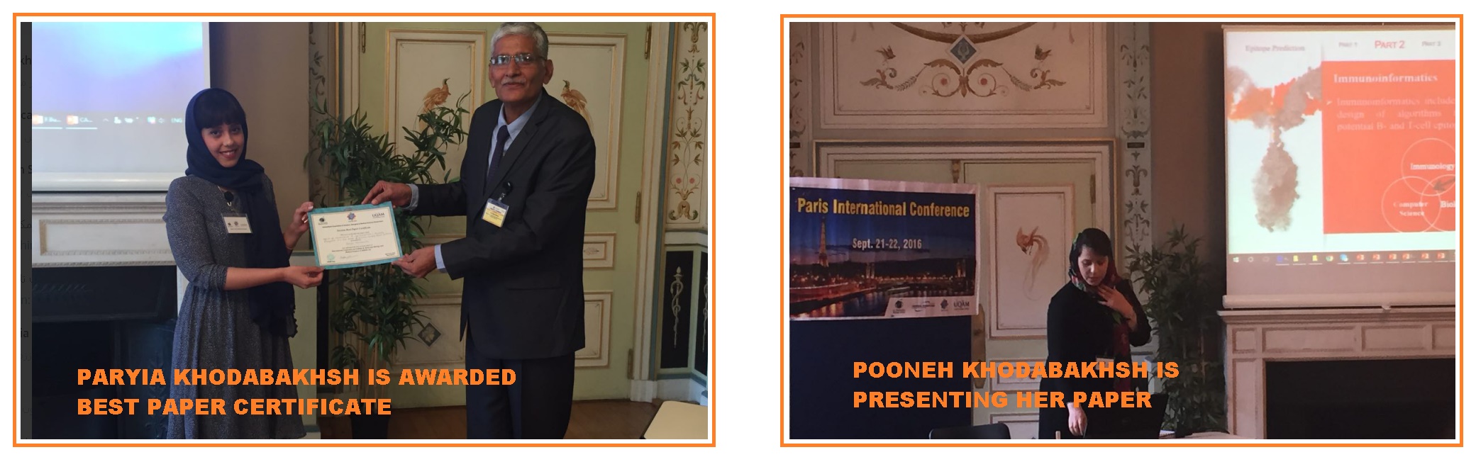 کنفرانس بین المللی علوم سلولی و مولکولی و پزشکی پاریس 2016 به پشتیبانی دانشگاههای کانادا و فرانسه در تاریخ یکم مهرماه سال جاری در پاریس برگزار گردید. در این کنفرانس بین المللی خانمها سارا فضل اللهی، مینو عرفانی، نادیا احتشام زاد ،فاطمه حیدری، سارا اقبال نیا، پریا خدابخش، عدرا توکلی، مریم مقدمی و آقای حجت الله مباشری و بهروز صابری (دانشپذیران دوره های مقاله نویسی) و خانمها پونه خدابخش، ثنا و ستایش بهنامفر و همچنین خانم دکتر زینب مبلغی (دانشپذیران آزاد) مقاله کامل ارایه داده و موفق به دریافت گواهینامه معتبر بین المللی شدند. از سویی، خانمها دکتر پریا خدابخش و پونه خدابخش با حضور در کنفرانس به ارایه مقالات خود پرداخته و با کمال خوشوقتی مقاله خانم دکتر پریا خدابخش به عنوان مقاله برگزیده انتخاب گردید.
